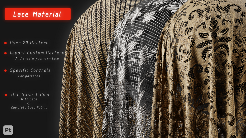 With the lace fabric, you have over 20 lace patterns with control over parameters, and you can also import custom patterns and create your own lace fabric.